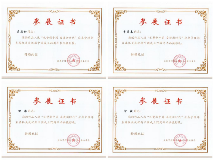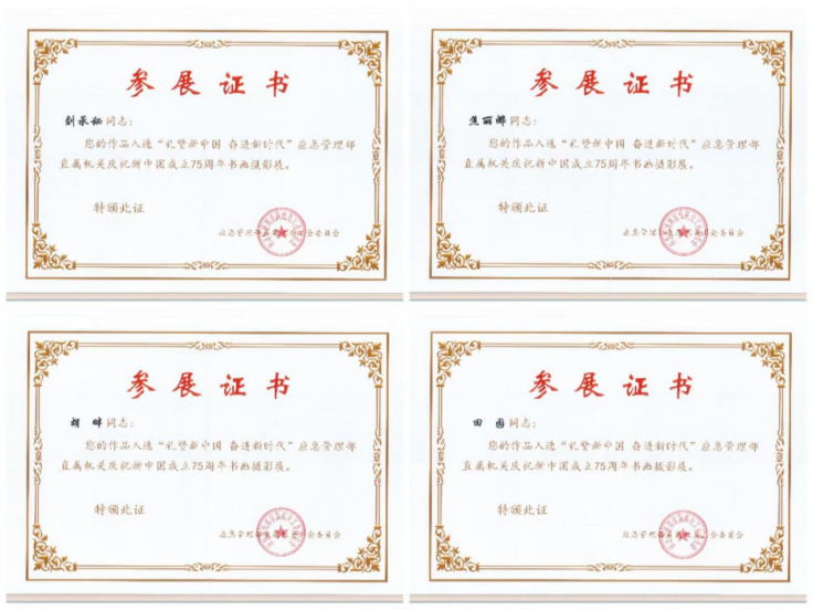 为歌颂新中国成立75年来走过的光辉历程、取得的辉煌成就,特别是党的十八大以来的生动实践、伟大成就和宝贵经验,激励应急管理部直属机关广大干部职工和消防救援指战员更加紧密地团结在以习近平同志为核心的党中央周围,满怀信心为以中国式现代化全面推进强国建设、民族复兴伟业团结奋斗,应急管理部直属机关工会委员会组织了“礼赞新中国 奋进新时代”书画摄影作品征集。我院职工和离退休职工紧紧围绕庆祝中华人民共和国成立 75 周年主题,抒发爱国之情、砥砺强国之志,积极报送作品,展现了在习近平新时代中国特色社会主义思想的科学指引下坚定不移跟党走、同心共筑中国梦的时代风采,在促进应急管理事业改革发展、推进应急管理体系和能力现代化进程中的精神面貌。