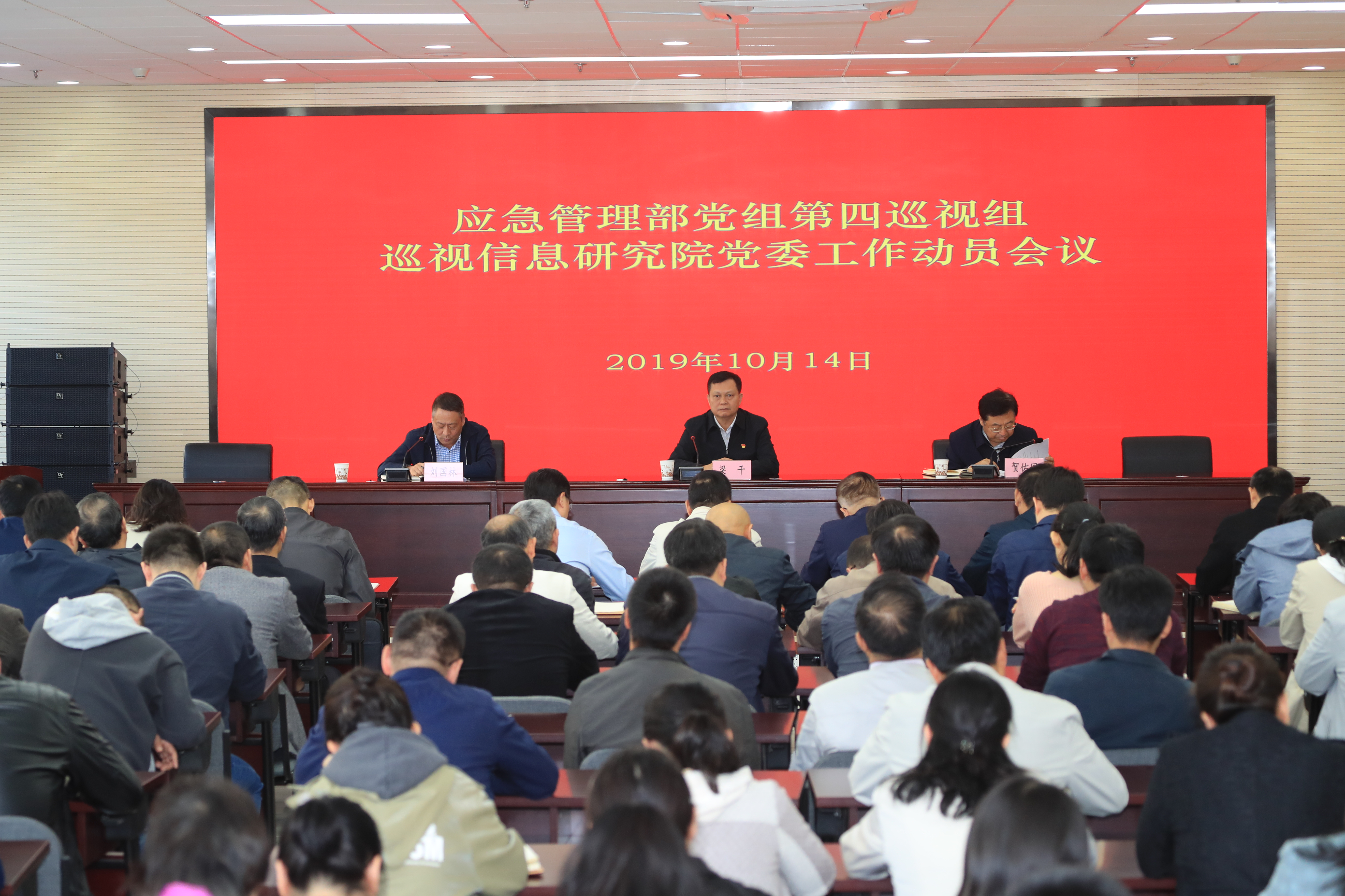 根据应急管理部党组关于巡视工作的统一部署,2019年10月14日,应急管理部党组第四巡视组巡视信息研究院党委工作动员会召开。会前,部党组第四巡视组组长梁干同志主持召开与院长贺佑国同志、党委书记刘国林同志的见面沟通会,传达了党中央精神和部党组关于巡视工作的有关要求,通报了相关工作安排。会上,梁干同志作了动员讲话,对做好巡视工作提出要求。刘国林同志主持会议并作表态发言。