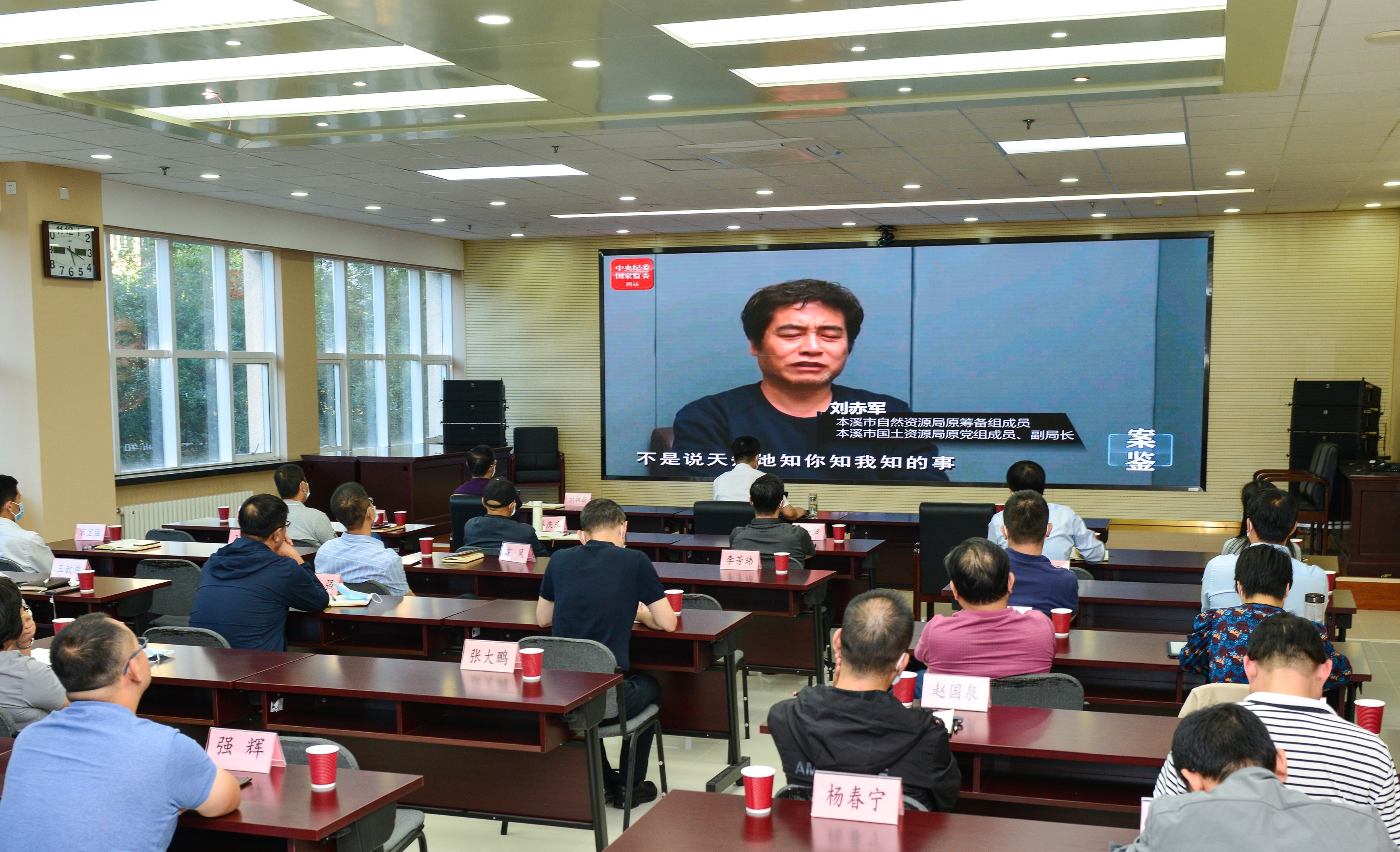上图为:党员干部在收看警示教育片