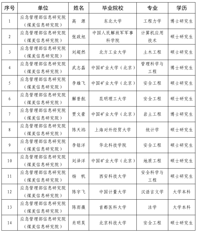 根据2024年度应急管理部所属单位公开招聘毕业生工作安排,经公开招聘接收14名高校毕业生,现予以集中公示。公示期间,如有异议,请向应急管理部信息研究院人事处反映。