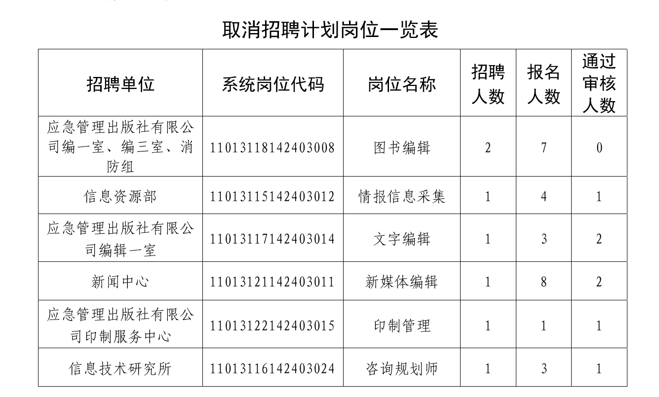 根据《应急管理部信息研究院2021年度公开招聘工作人员公告》,我院公开招聘网上报名工作已经结束,根据报名审核情况,有6个岗位通过报名资格初审的人数与该岗位招聘人数的比例未达到3:1,经研究,决定取消6个岗位共7名招聘计划(见下表)。