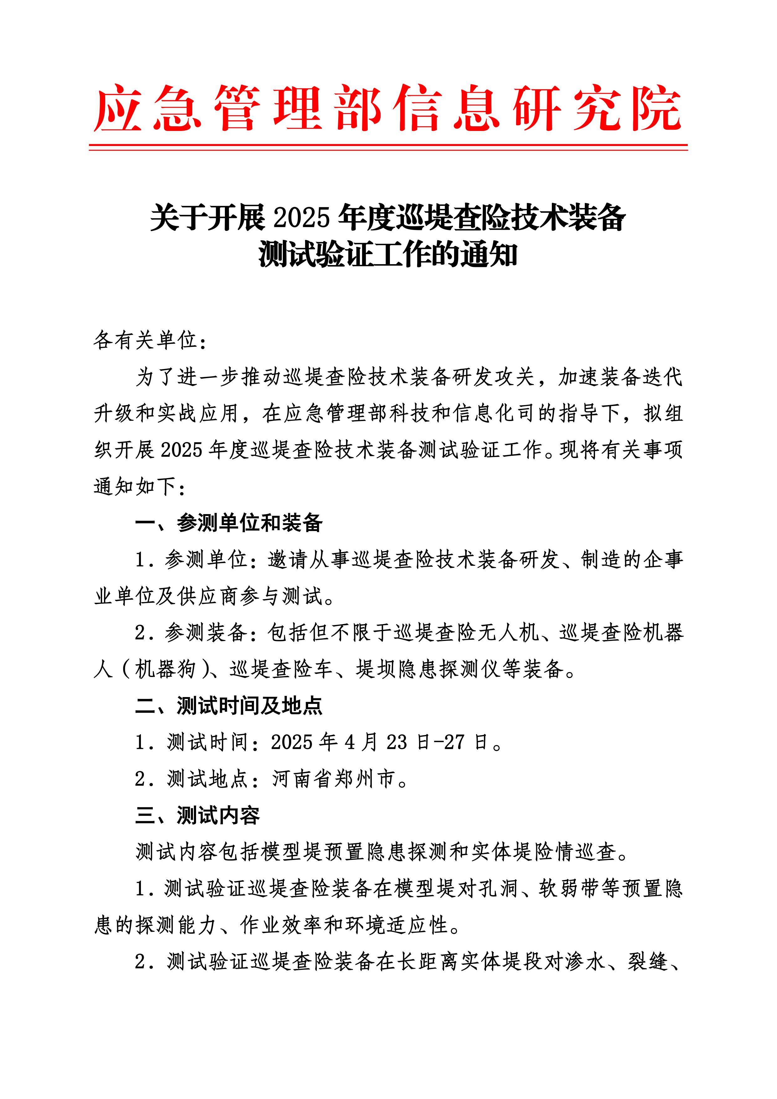 关于开展2025年度巡堤查险技术装备测试验证工作的通知