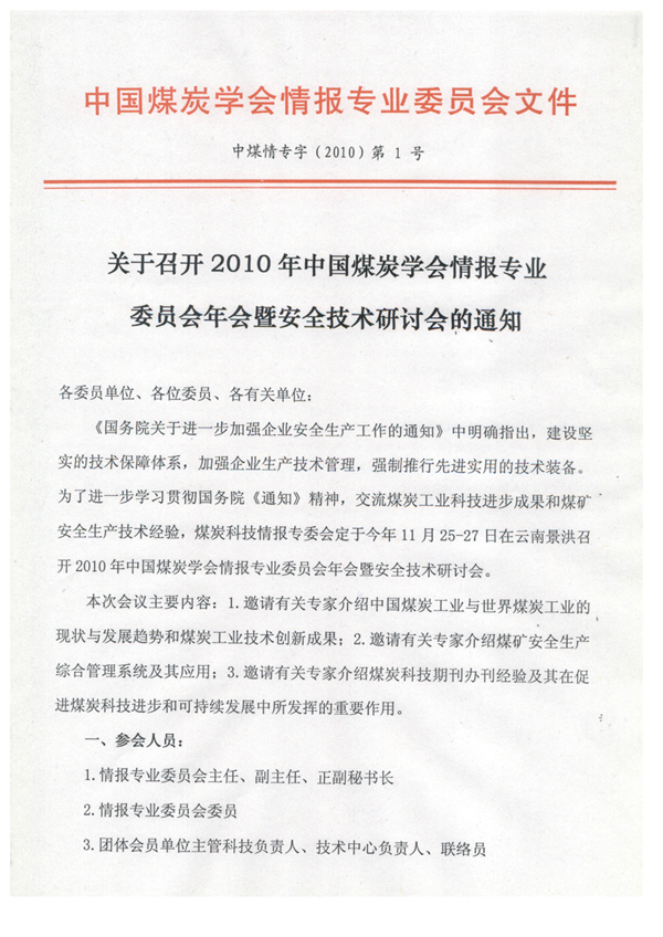 关于召开2010年中国煤炭学会情报专业委员会年会暨安全技术研讨会的通知