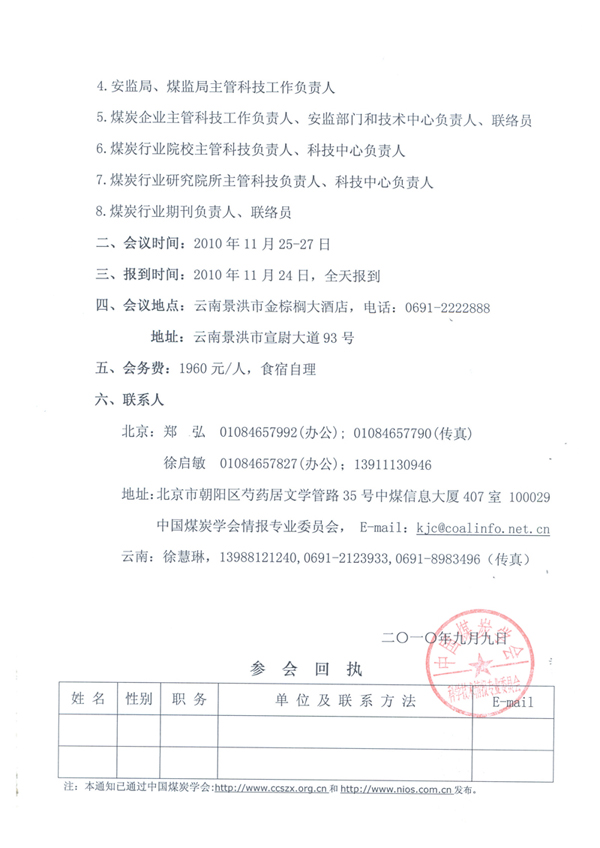 2010年中国煤炭学会情报专业委员会年会暨安全技术研讨会日程安排