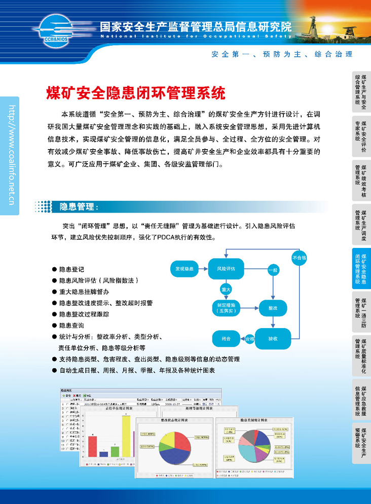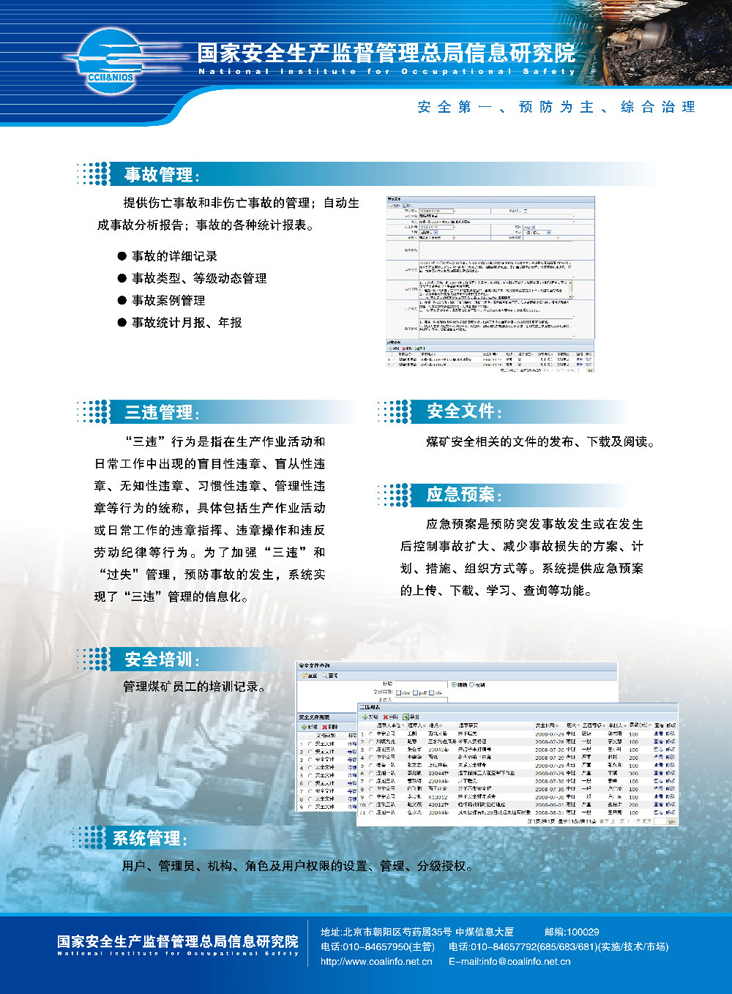本系统遵循“安全第一、预防为主、综合治理”的煤矿安全生产方针进行设计,在调研我国大量煤矿安全管理理念和实践的基础上,融入了现代管理思想,采用先进计算机信息技术,实现煤矿安全管理的信息化,满足全员参与、全过程、全方位的安全管理。对有效的减少煤矿安全事故、降低事故伤亡,提高矿井安全生产和企业的效率都具有十分重要的意义。可广泛应用于煤矿、企业集团、各级安监管理部门。
