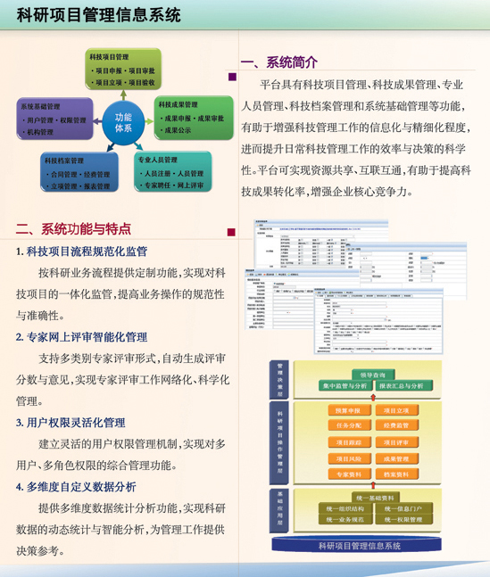 针对科技业务管理工作存在工作量大,流程、标准亟待规范统一等问题,开展科技项目管理系统的技术研发。利用计算机网络手段实现科技计划项目管理、科技成果管理、专家管理、知识产权和各类奖项的管理等核心工作业务的科技管理现代化,提高管理水平,降低管理成本,提高科技管理的工作效率,形成资源共享、互联互通的科技项目管理信息系统平台。通过科技项目管理系统,实现项目申报、项目审批、项目立项、项目跟踪、奖励评定、知识产权和专家评审等业务流程自动化;全面系统地掌握科技管理过程的动态信息,建成上下互动、协调运行的科技管理信息化平台;借助网络信息化辅助科技管理人员的工作,加强相关人员的协同工作能力,借助技术手段降低工作量,提升工作效率。