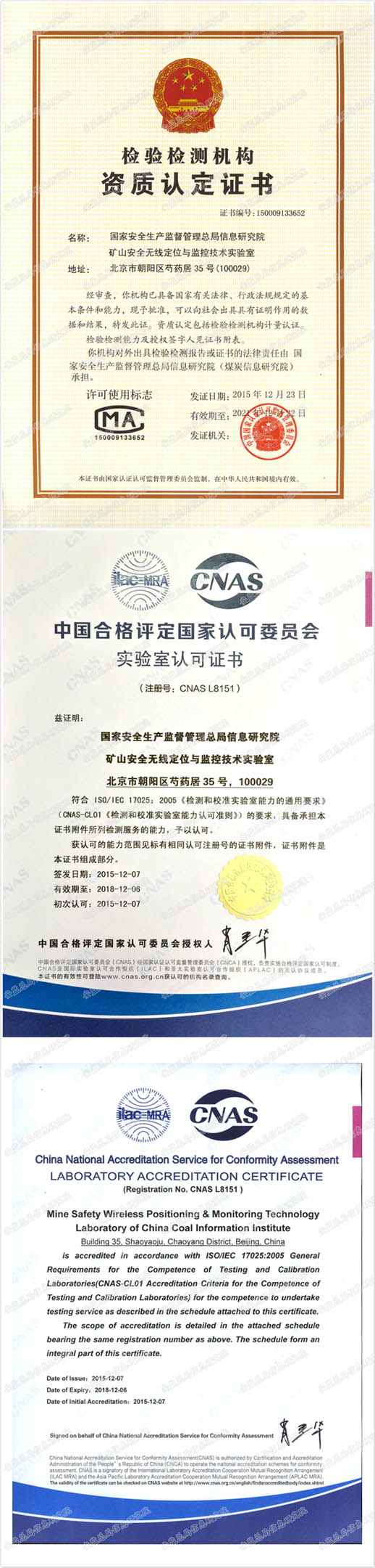 矿山安全无线定位与监控技术实验室具有国家级计量认证(CMA),中国合格评定国家认可委员会认可实验室(CNAS)等权威资质,作为国家级第三方检测检验机构,现面向政府、科研机构以及企事业单位提供整体技术测评方案,涵盖软件产品功能性测评、可靠性测评、易用性测评、性能评测、维护性测评等软件相关领域的测评工作。