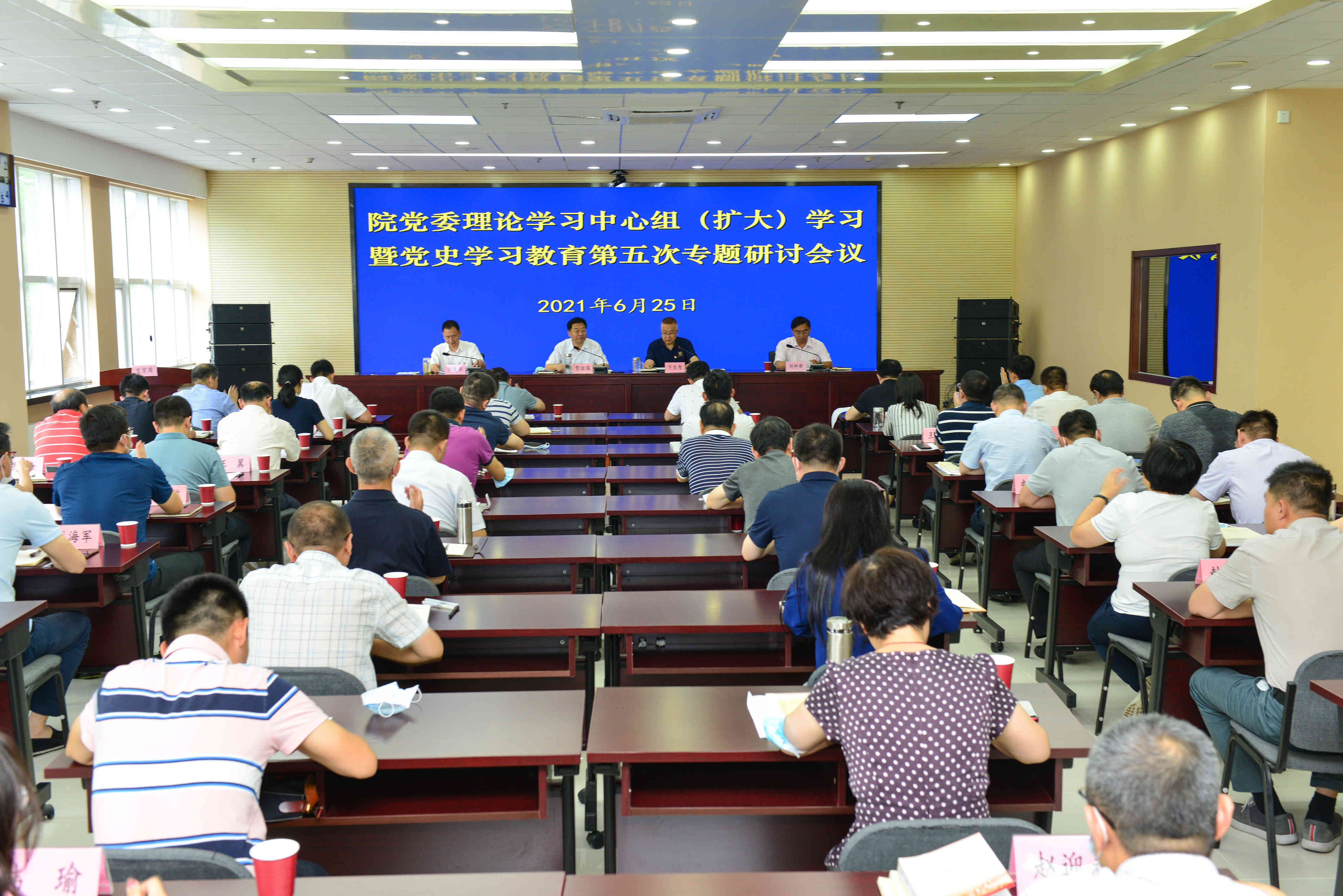 6月25日下午,信息研究院党委召开院党委理论学习中心组(扩大)第9次学习暨院党史学习教育第5次专题研讨会,围绕院党委开展党史学习教育实施方案确定的第5个议题开展集中研讨。院长、党委副书记贺佑国主持会议,院党委成员、副院长卞生智传达了习近平总书记在青海考察期间重要讲话精神,院党委成员、总会计师刘柯新作了主旨发言,9位部门、单位负责人交流了学习心得体会。在家的院党委理论学习中心组成员及院副处级以上党员干部、院党委党史学习教育领导小组办公室全体成员、部分党员代表参加了此次研讨会。