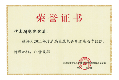 6月30日,国家安全监管总局直属机关纪念中国共产党成立90周年暨“两优一先”表彰大会在京召开,信息院党委荣获总局直属先进基层党组织称号,刘文革、黄勤、赵一归、王杰同志荣获总局直属机关优秀党员称号。