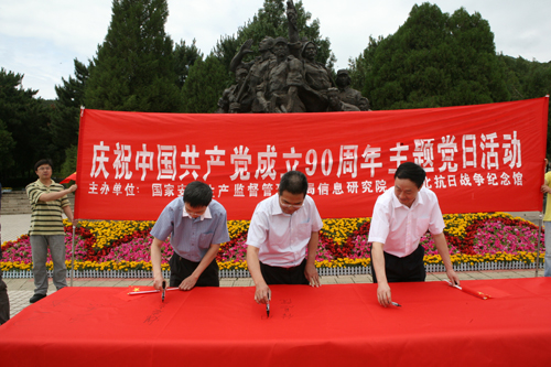 信息院党委向平北抗日烈士敬献花圈、全体党员在烈士纪念碑前重温了入党誓词,院党委书记吕敬民同志在活动仪式上作了讲话,号召全院共产党员认真贯彻落实总局党组的部署和总局直属机关党委的要求,认真学习贯彻落实中共国家安全监总局直属机关第一次代表大会精神,充分发挥基层党组织的战斗堡垒作用和共产党员的模范带头作用,进一步提升服务总局中心工作的支撑能力,振奋精神,扎实工作,力争完成和超额完成全年经营目标任务,为伟大的中国共产党九十华诞献礼。
