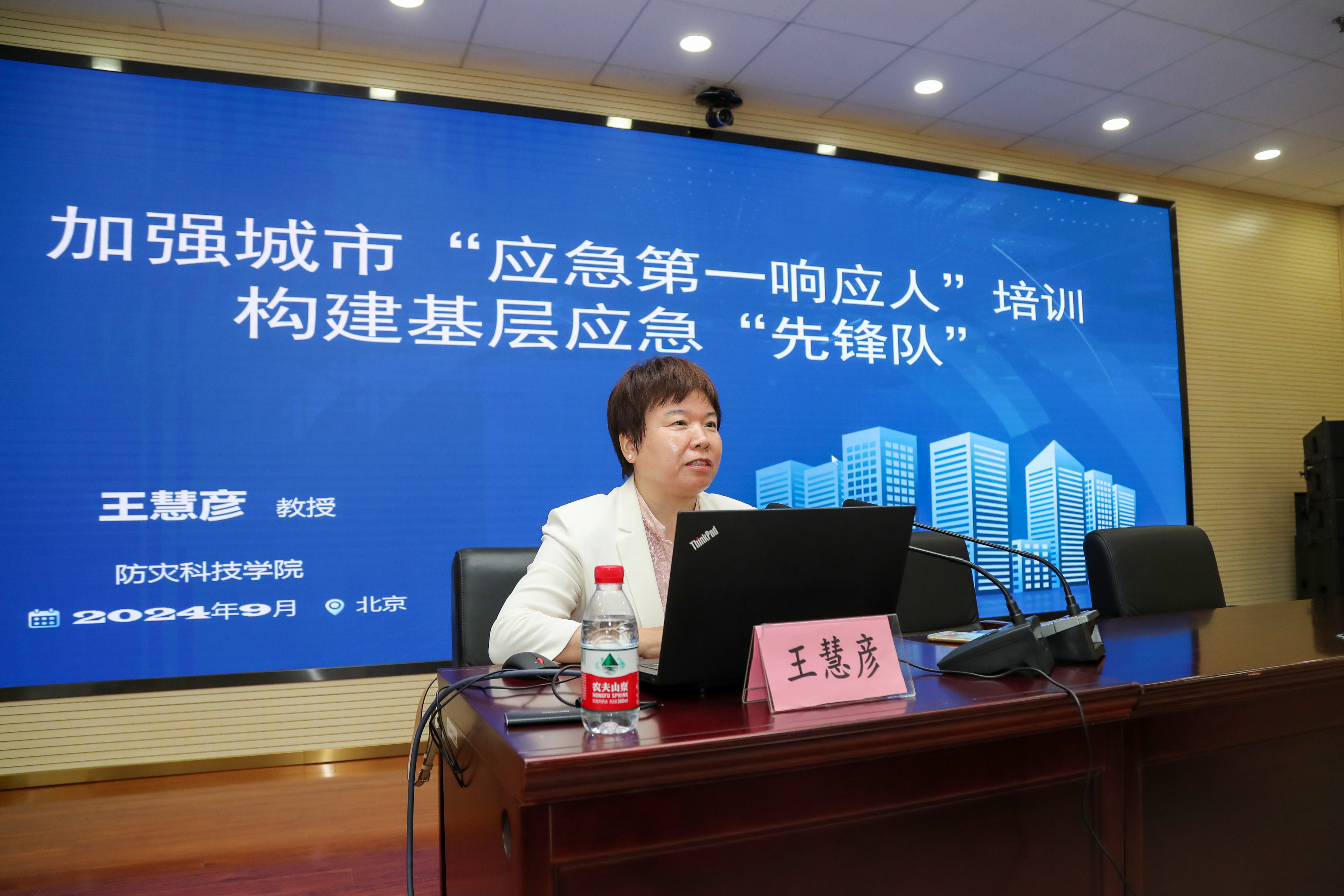 防灾科技学院王慧彦教授作了题为《加强城市“应急第一响应人”培训 构建基层防灾减灾“先锋队”》的精彩讲座。王教授以其深厚学术功底和丰富实践经验,深入浅出地讲解了“应急第一响应人”机制建设框架及培训体系。
