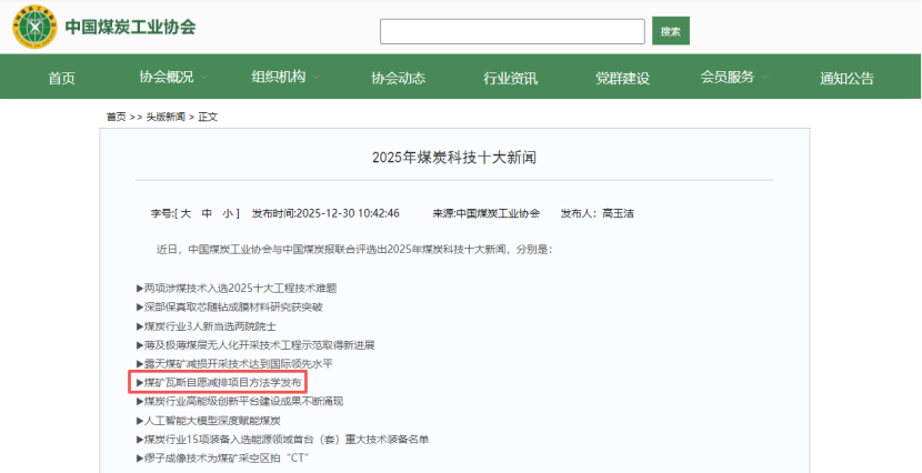 2025年12月30日,由中国煤炭工业协会和《中国煤炭报》联合评选的《2025年煤炭科技十大新闻》发布,“煤矿瓦斯自愿减排项目方法学发布”荣登“2025年煤炭科技十大新闻”第六项。