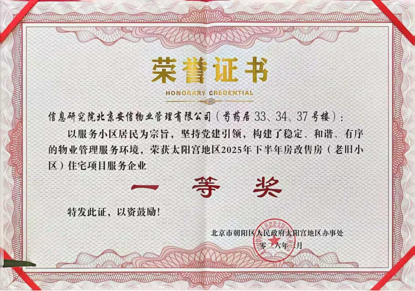 近日,北京市朝阳区太阳宫地区办事处召开“2025年下半年优秀住宅项目物业服务企业表彰会”,信息研究院所属北京安信苑物业管理有限公司(以下简称公司)荣获一等奖,奖金2万元。