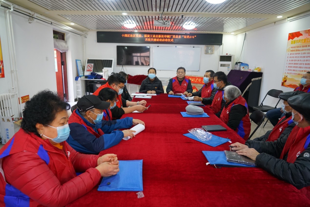 12月2日下午,煤炭工业出版社印刷厂党总支、十四区社区党委 “红色1+1”共驻共建活动启动仪式在十四区社区会议室举行。煤炭工业出版社印刷厂党总支乔书记、煤炭工业出版社印刷厂退休十四区支部党员代表、在职党员共计13人,与十四区社区党委书记、党员志愿者、工作人员共同出席了此次仪式,仪式由十四区社区党委副书记主持。