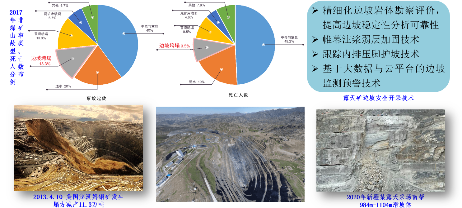 5.高陡边坡滑坡风险防控。边坡滑坡坍塌事故居露天矿安全事故的第一位,高陡边坡地质灾害机理不清和理论不完善是大型露天矿安全生产的主要科学难题。