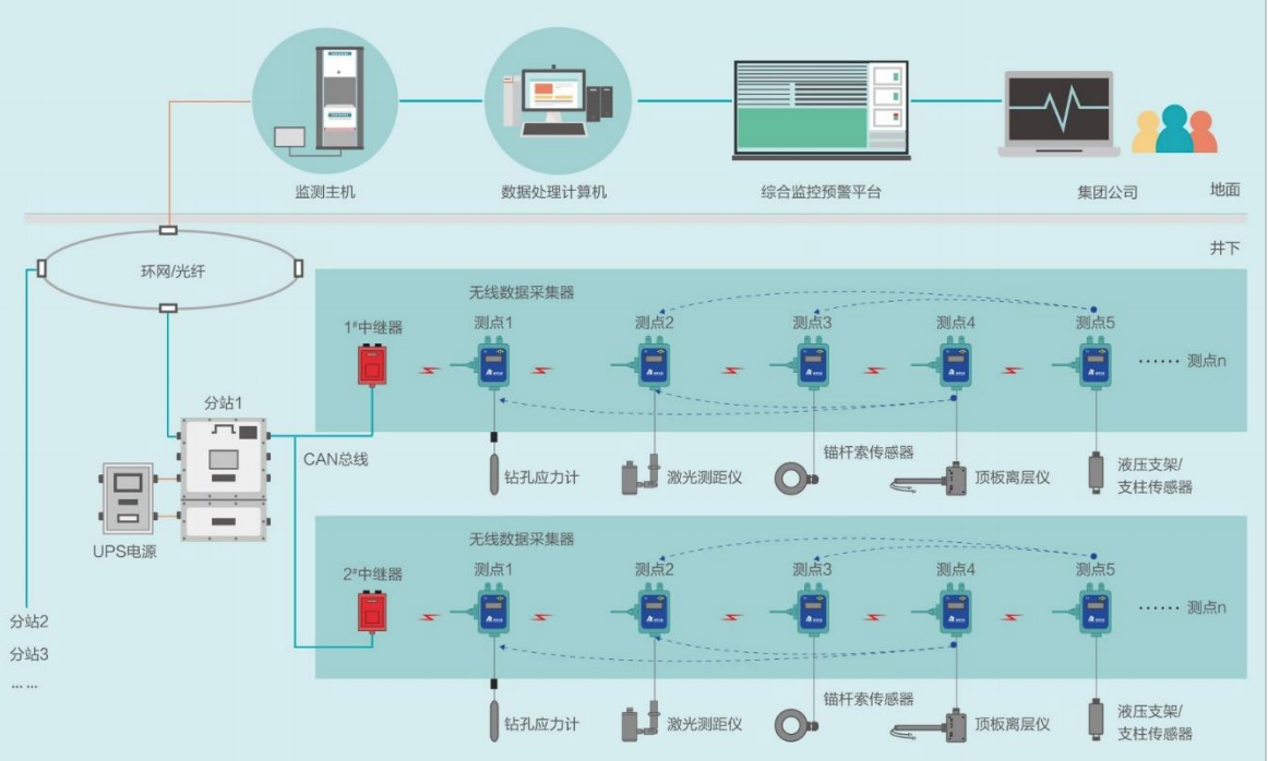 合作研发冲击地压多参量预警监测系统。可实现工作面及巷道煤体应力、锚(杆)索应力、顶底板围岩变形、深部围岩离层、支柱工作阻力等多种矿压参量的实时在线监测和预警。